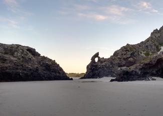 Massive sandstone sea arches and a hand carved tunnel to a concealed beach.