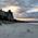 Expansive beach sheltered by rugged headland looking over a rocky island.