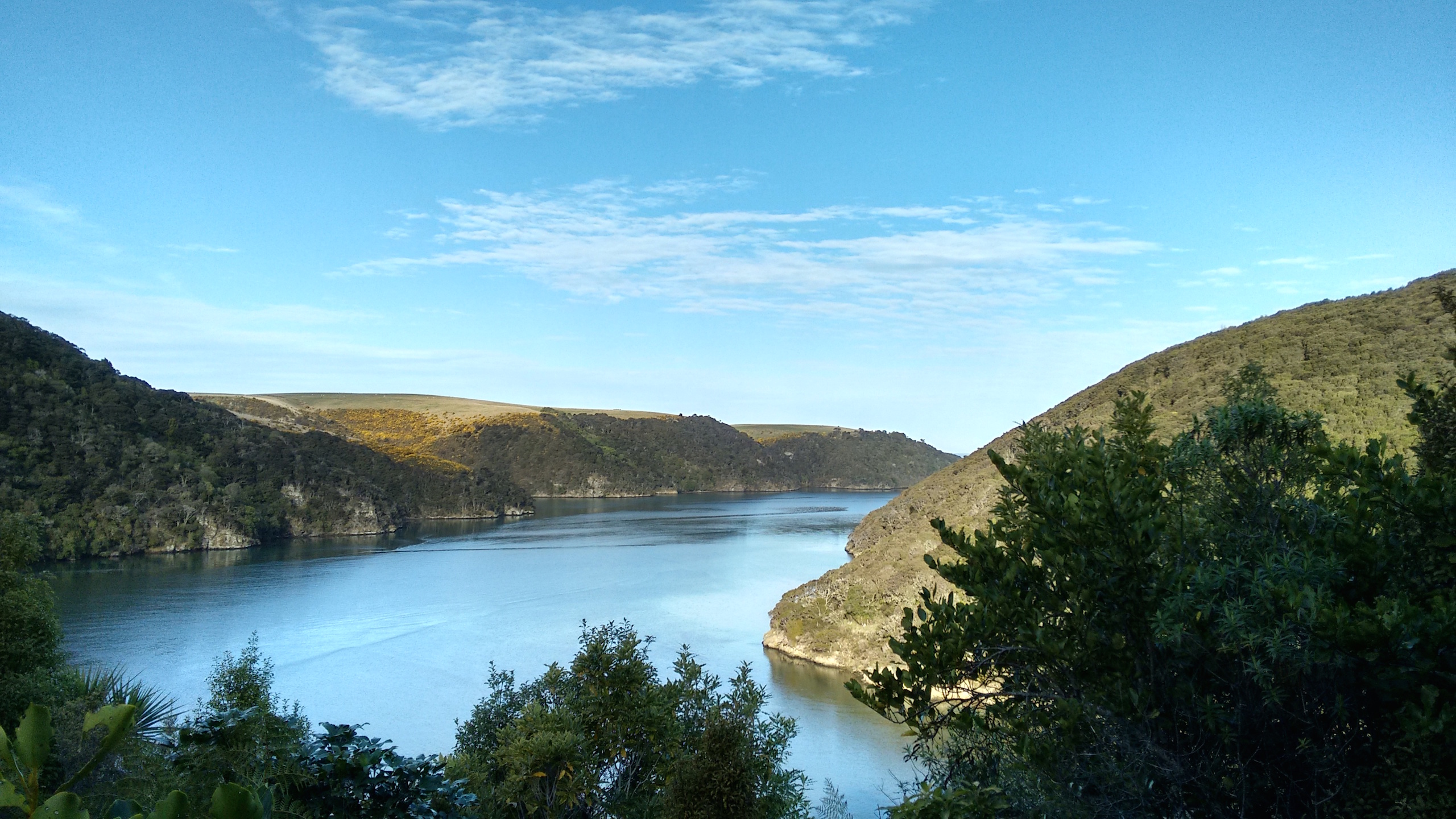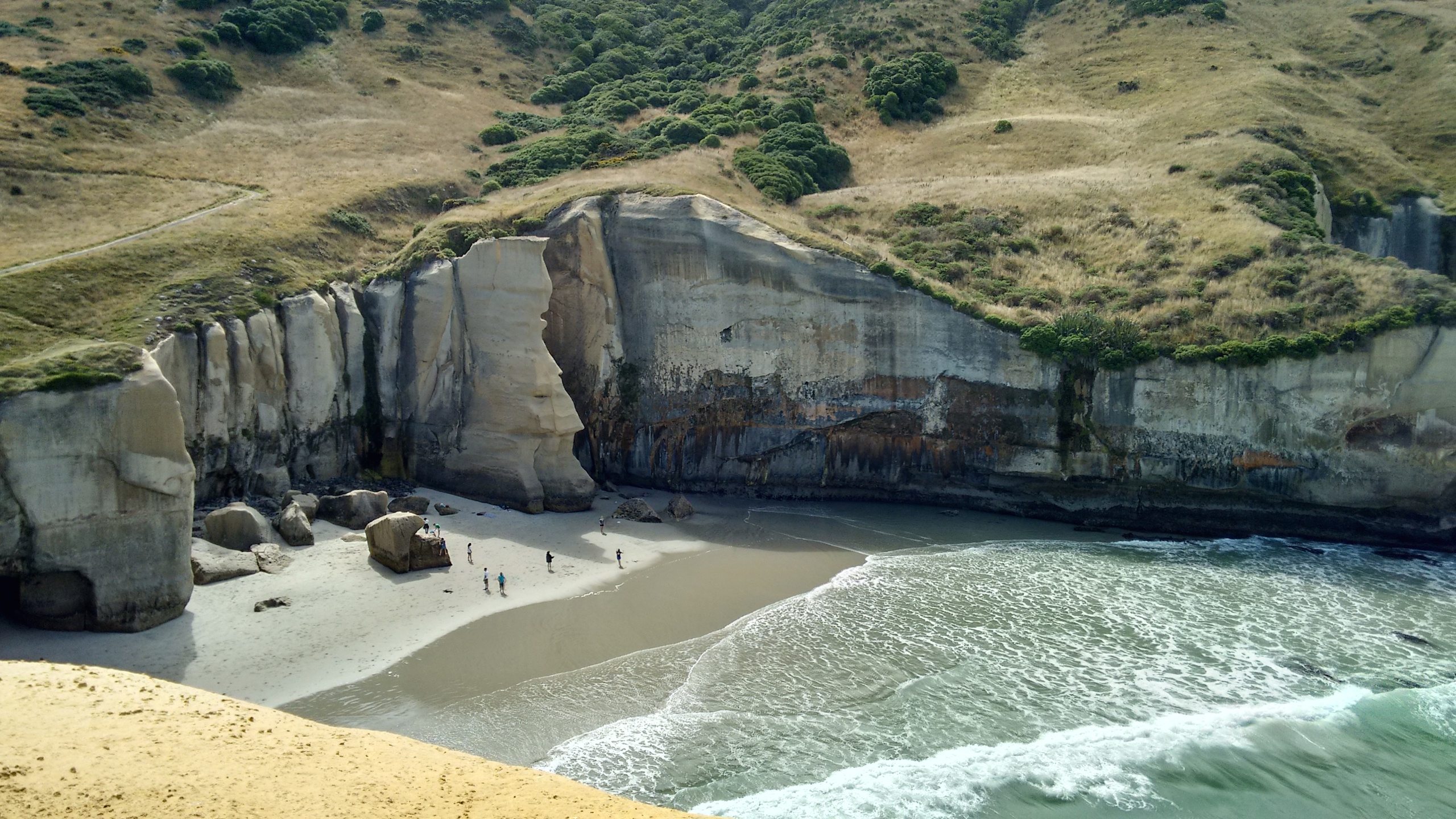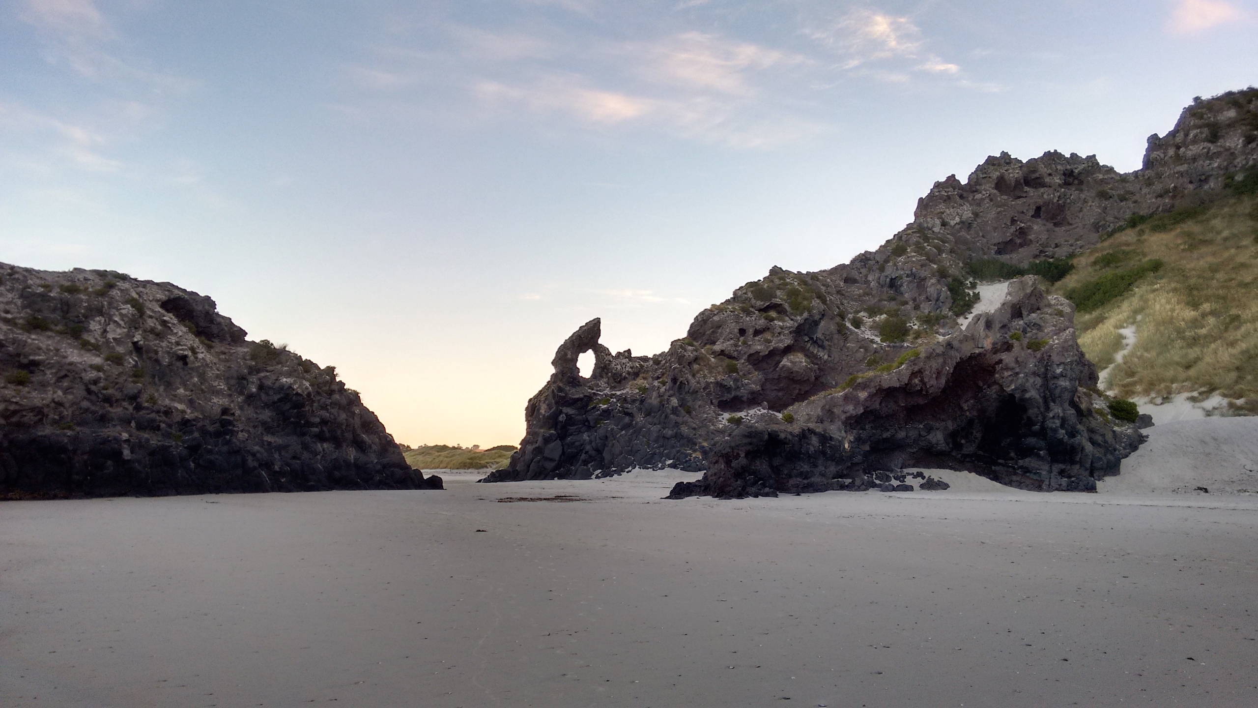 Serene watery area north of Dunedin with large sandy beaches and rock sea caves.