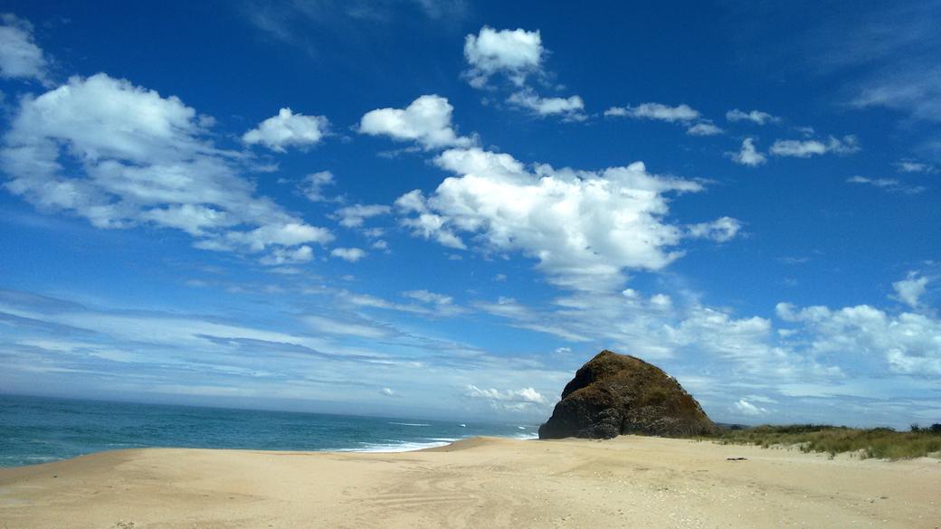 On arrival, you’ll find a short walking track to the beach. The beach itself is an astonishing sight. The Pacific Ocean spans across the horizon, the golden sands of the beach separating it from the thriving tussock in the sand dunes. The large rock formation on the beach is known as Cook’s Head Rock. It provides shade for a break, and a vantage point for those adventurous enough to climb it.